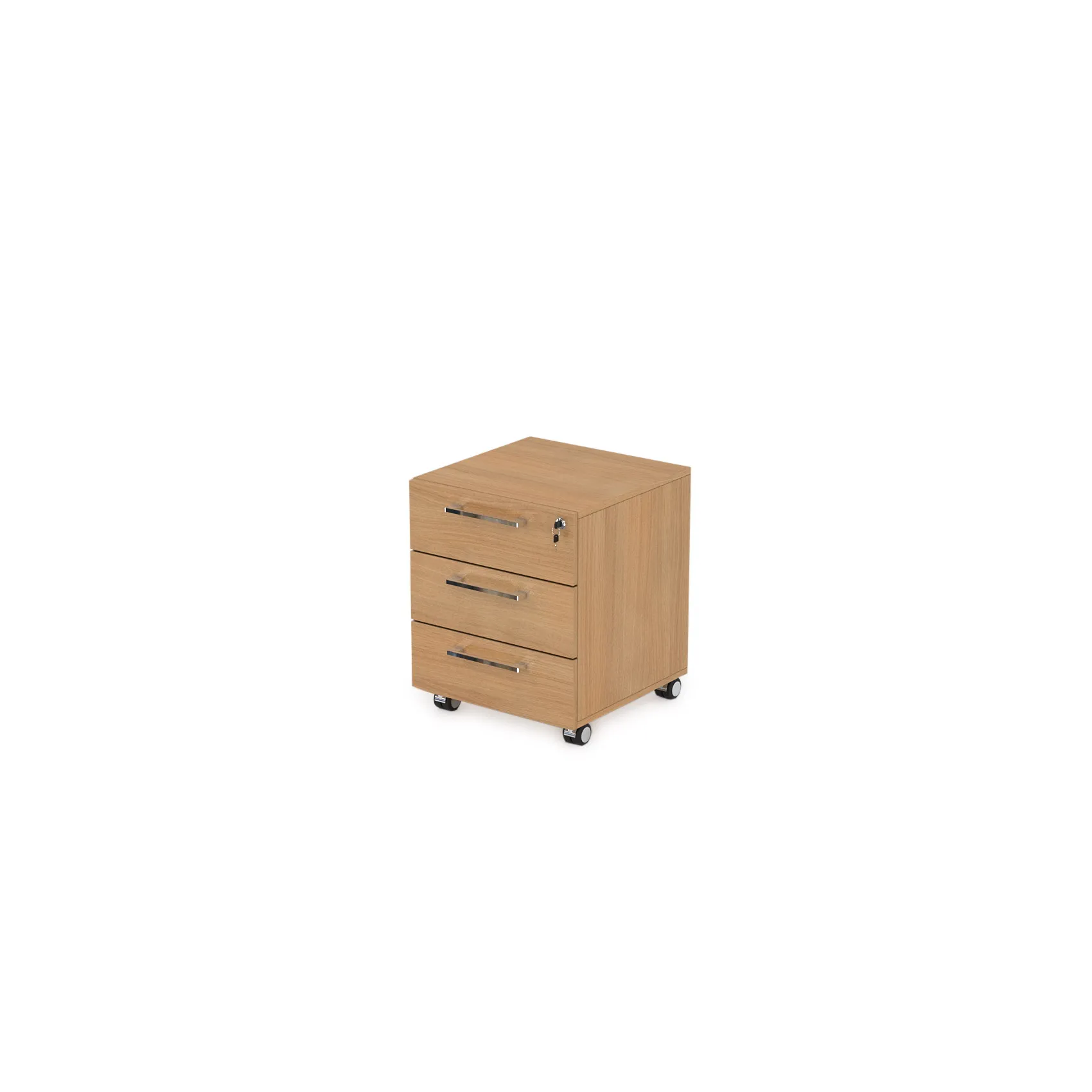 Тумбы оснащены усиленными хромированными колесами с мягким ходом и шариковыми направляющими полного выдвижения. Лицевая фурнитура премиум класса/наличие замка на верхнем ящике.