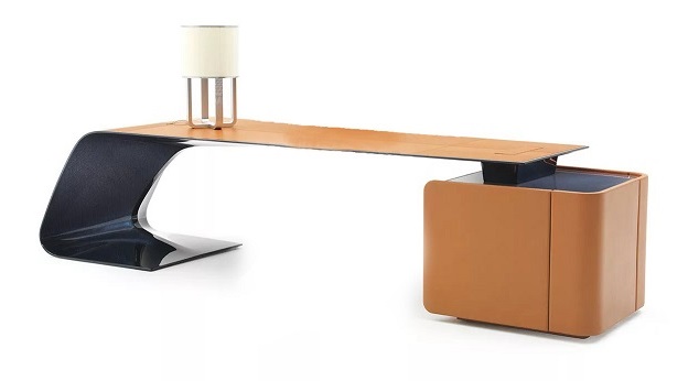 Столешница: высококачественная оранжевая кожа со строчкой. Нижняя часть: однотонная покраска. Внешние панели, дверки, фасады ящиков боковой тумбы: кожа со строчкой.